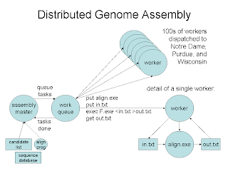 Lately, my research group has been collaborating with Prof. Scott Emrich on several problems in bioinformatics. Our students Chris Moretti and Mike Olson have been building a system for carrying out whole-genome assembly problems on campus grids. They recently got it scaled up to run on nearly 1000 nodes spread across Notre Dame, Purdue, and Wisconsin, making the problem complete in a few hours instead of a few weeks. We are excited to move the system into production use to start working on some real assembly problems.