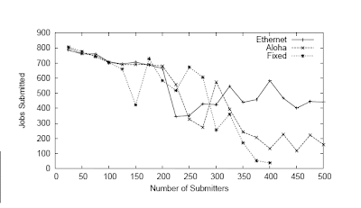 Internally, the shell takes care of all of the error detection, retries, and so forth, so that the programmer can concentrate on the essential issues. The end result is that the system becomes much more robust to load bursts. For example, the following graph shows the performance of many clients submitting batch jobs to a queue using three methods: the Ethernet approach, the Aloha approach (an intermediate step), and a simple fixed retry: