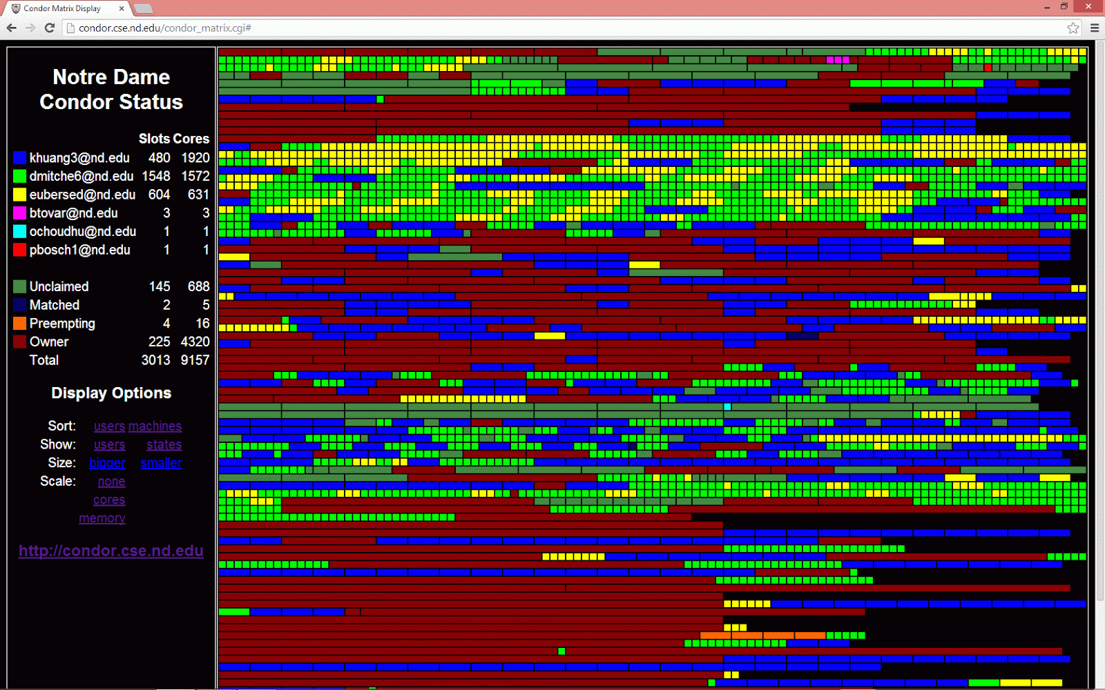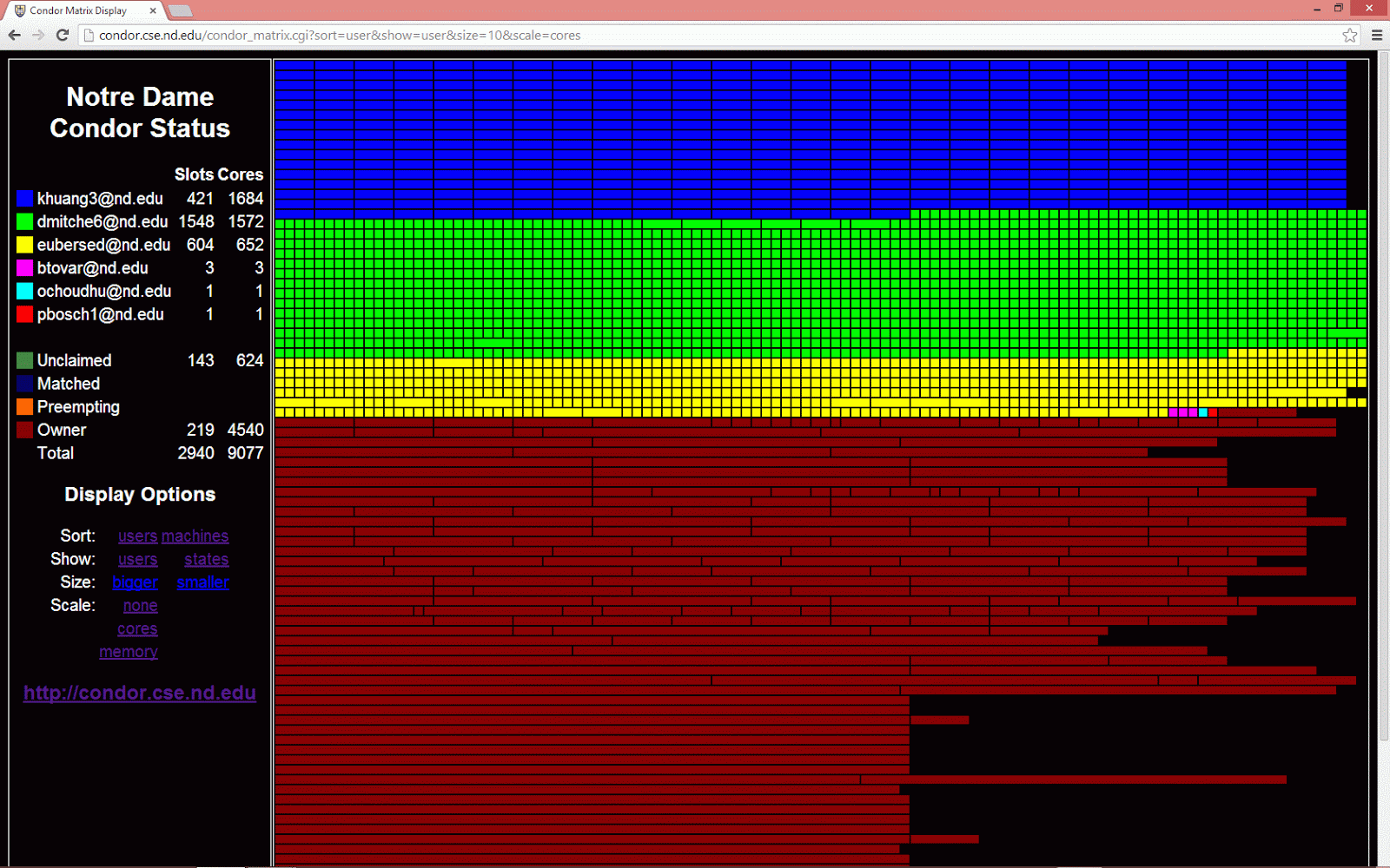 Our Condor pool at the University of Notre Dame has been slowly growing, in no small part due to our collaboration with the Center for Research Computing, where it is now scavenging unused cycles from HPC clusters at the CRC. When the dedicated batch system leaves a node unused, Condor is started on that node and keeps going until the dedicated system wants the node back. Depending on the time of year, that leaves anywhere between 4K and 10K nodes available in the Condor pool.