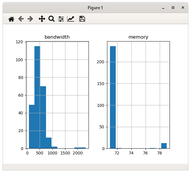 1595431788501342 10489 TASK 1 DONE SUCCESS 0 {} {"cores": 2, ...} With a regular expression incantation, we can extract the resource information into python's pandas. Say, for example, that we are interested in the memory and bandwidth distribution among the executed tasks. We can read these resources as follows: