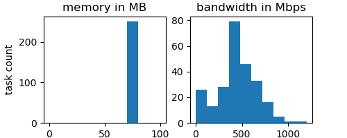# size width x height in inches fig = plt.figure(figsize=(5,2)) # 1 row, 2 columns, 1st figure of the array mem = plt.subplot(121) mem.set_title('memory in MB') mem.set_ylabel('task count') mem.hist(df['memory'], range=(0,100)) # 1 row, 2 columns, 2nd figure of the array mbp = plt.subplot(122) mbp.set_title('bandwidth in Mbps') mbp.hist(df['bandwidth'], range=(0,1200)) fig.savefig(input_file + '.png')