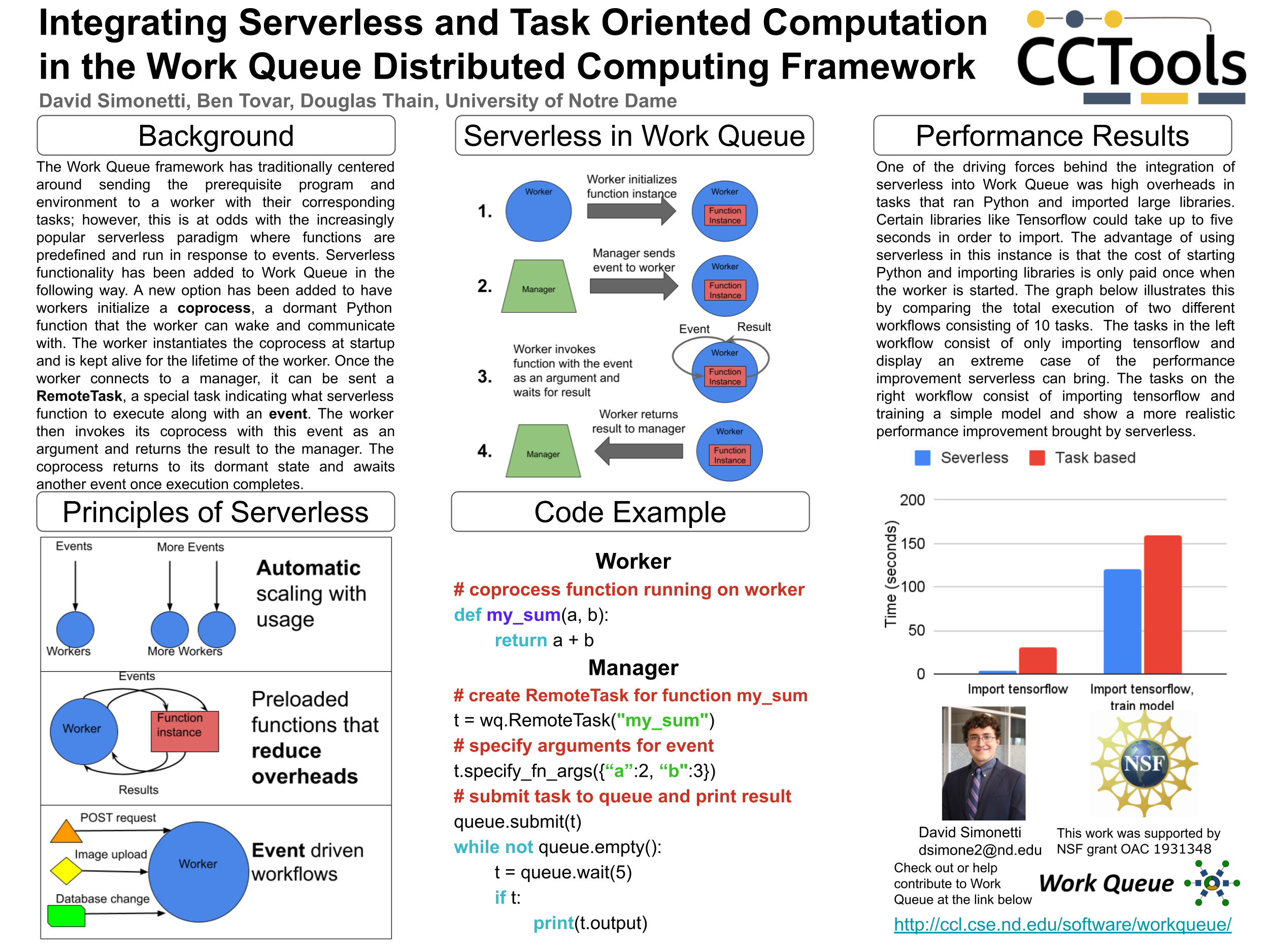 David Simonetti, a junior undergraduate at Notre Dame, recently completed a summer REU project in which he added “serverless” computing capabilities to the Work Queue distributed computing framework.