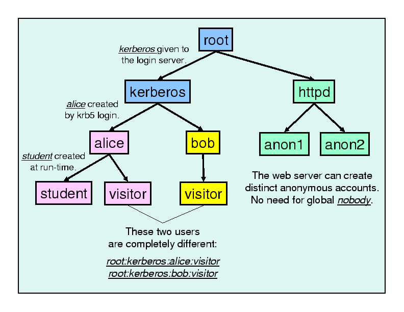A simple example of this is the matter of identifying users. An ordinary user would like to be able to create protection domains in order to run untrusted code coming in from the grid or downloaded from the web. But, creating accounts is limited to the superuser, partially because of the simple data structure (an integer) used to represent a user internally. Strangely, in order to restrict the privilege of a sub-process, one must fist elevate privilege to become the superuser.
